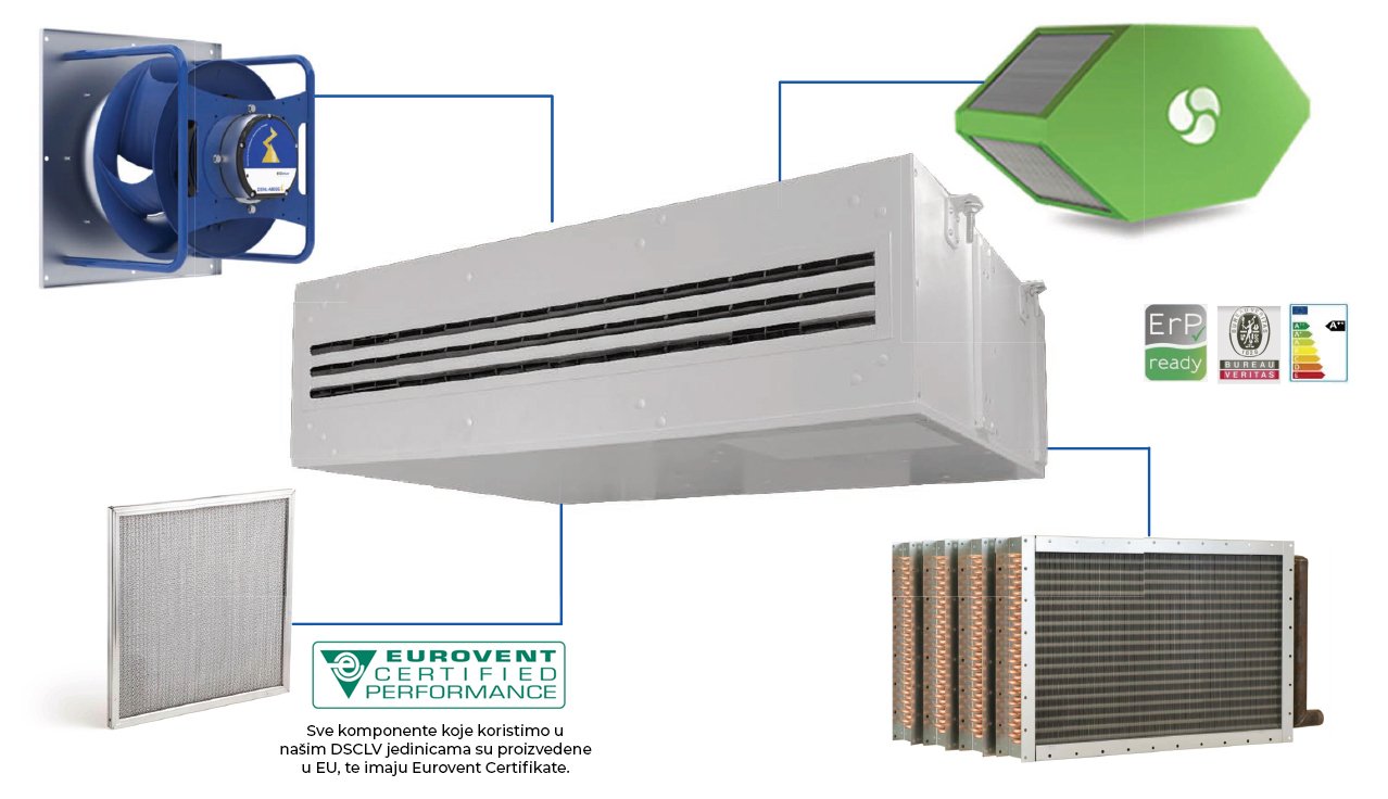DSCLV units with heat recovery are intended to improve indoor air quality with maximum energy conservation for air flows of 200 to 750 m3/h, and are intended for installation under the ceiling. These units, primarily designed for work in schools, kindergartens, offices and residential buildings, are sound and thermally insulated, and with normal air flow they generate noise less than 49 dB(A), which makes them suitable for work in classrooms, offices and other areas where a low noise level is required. The enthalpy lamellar countercurrent exchanger (recuperator) ensures heat recovery of up to 92%.