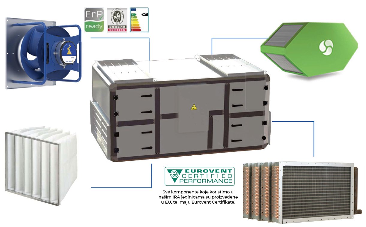 IRA units with heat recovery are intended to improve indoor air quality with maximum energy conservation for air flows from 2500 to 12500 m3/h. These compact or modular units ensure efficient ventilation and air conditioning of spaces (residential, business and industrial) with a heat recovery rate of up to 91% and low electricity consumption.